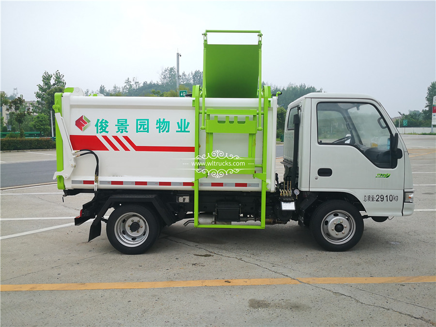 JAC 4m3 gasoline engine hanging bucket garbage truck photos adopt Wuling 88hp Eruo 5 engine