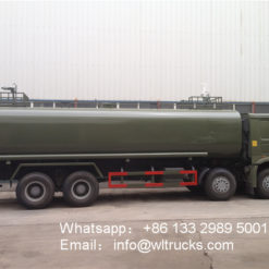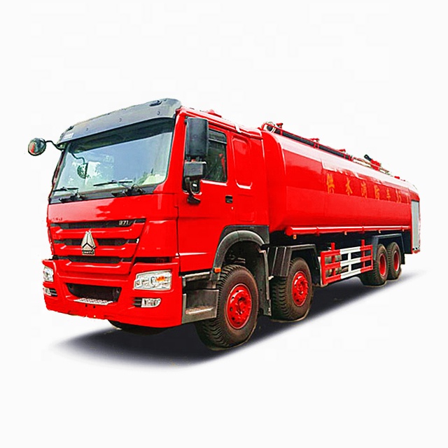 8×4 Sinotruk Howo 25000 liter fire water truck is modified by Sinotruk ZZ1317N4667E1B chassis, flat-head single row with horizontal cab, Sinotruk 371 horsepower engine, Euro III emission standard, tank volume 21 cubic meters, maximum 25 cubic meters, front flush, rear sprinkler, side Spraying, rear working platform with green sprinkler; self-priming and self-draining, front flushing, rear spraying, side spraying, rear working table with high-pressure gun, high-pressure gun water spray can be adjusted into columnar and mist, equipped with large Power-specific Hangzhou Weilong sprinkler pump, with fire-fighting joint, self-flow valve, tank body made of 4 mm high-quality carbon steel, with 2 4 m long suction pipes.