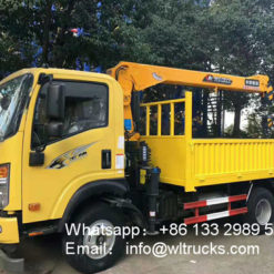 Sinotruk 3 ton small crane truck Adopt Sinotruk Ace 2080 single-row cab, wheelbase 3360mm, engine is Xichai 95 horsepower, 5-speed gearbox, 230 beams, 4 tons rear axle, heater, air brake, power steering, ABS. It is loaded with 2 tons of 3-section straight arm crane (model SQS42-3), with a maximum lifting height of 9 meters, a working radius of 7.9 meters, and full rotation.